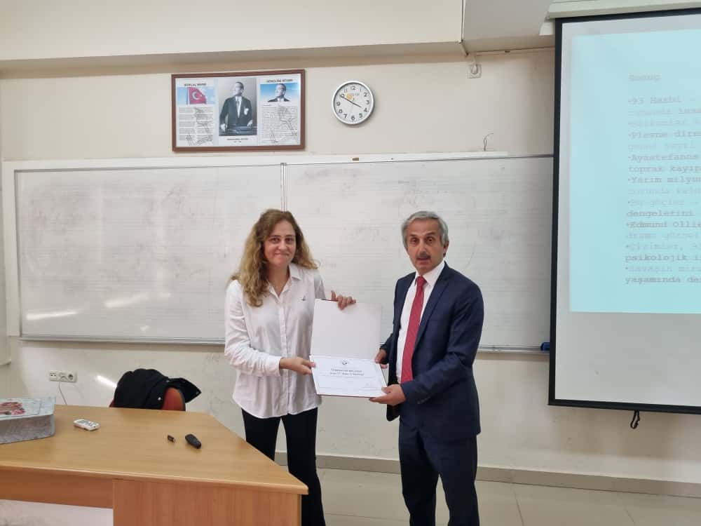 İnsan ve Toplum Bilimleri Fakültesi 2025-2026 Güz Dönemi seminerleri başladı. Dönemin ilk semineri, 7 Ekim’de “Görsel Anlatımla 93 Harbi” başlığıyla Öğr. Gör. Dr. Bahar Karataş tarafından verildi. Seminerin sonunda öğretim görevlimize fakülte dekanı Prof. Dr. Bilal Kırımlı tarafından teşekkür belgesi takdim edildi.