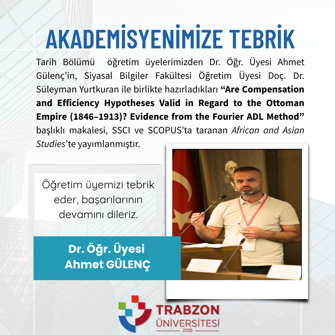 Fakültemiz Tarih Bölümü öğretim üyelerinden Dr. Öğr. Üyesi Ahmet Gülenç’in, Siyasal Bilgiler Fakültesi Öğretim Üyesi Doç. Dr. Süleyman Yurtkuran ile birlikte hazırladıkları “Are Compensation and Efficiency Hypotheses Valid in Regard to the Ottoman Empire (1846–1913)? Evidence from the Fourier ADL Method” başlıklı makalesi, SSCI ve SCOPUS’ta taranan African and Asian Studies’te yayımlanmıştır.